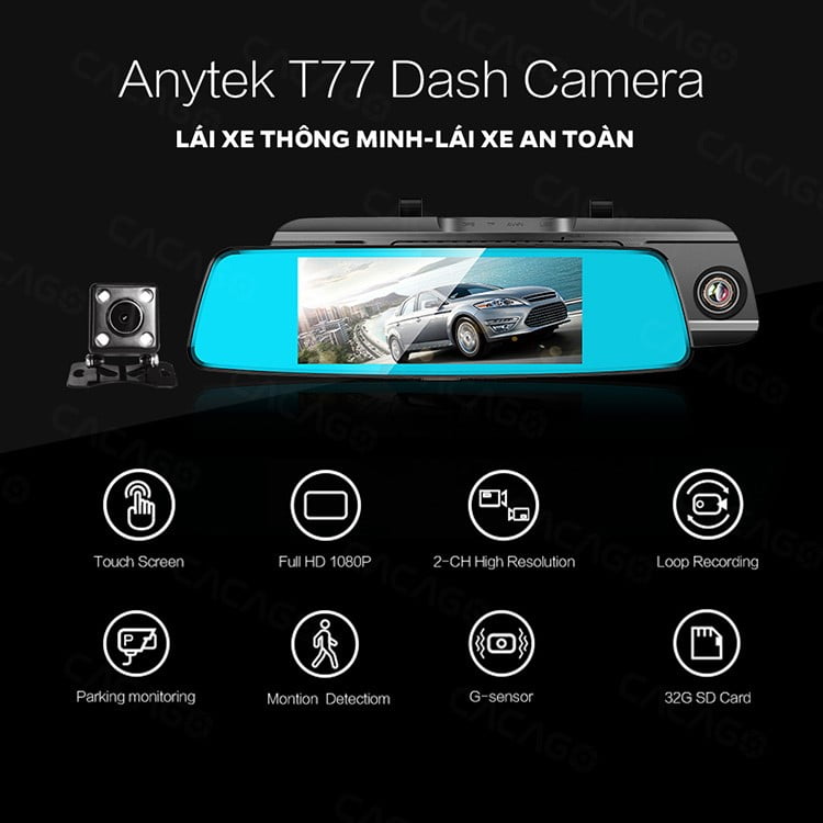 Anytek T77 là sản phẩm của Nhật Bản, tích hợp với gương ô tô và sử dụng thay gương chiếu hậu. Về thiết kế Anytek T77 có khả năng tự cân bằng ánh sáng, chống chói nhờ công nghệ Wide Dynamic Range. Màn hình LCD 7 inch, độ phân giải 1920×1080 giúp bạn dễ dàng quan sát. Anytek T77 có thể hỗ trợ tiến lùi, quan sát trước, sau một cách hiệu quả.